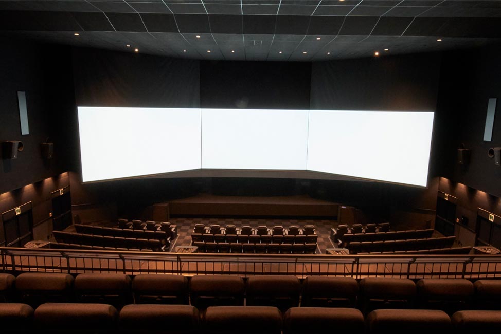 松竹マルチプレックスシアターズで導入されている「3面ライブスクリーン」は、300インチを超える巨大スクリーンを3面配置した、次世代型映画上映システム。正面のスクリーンに加え、左右にスクリーンを配置することで多彩な表現が可能となり、上映の最初から最後まで常時3面全てに大迫力の映像が映し出されます。
